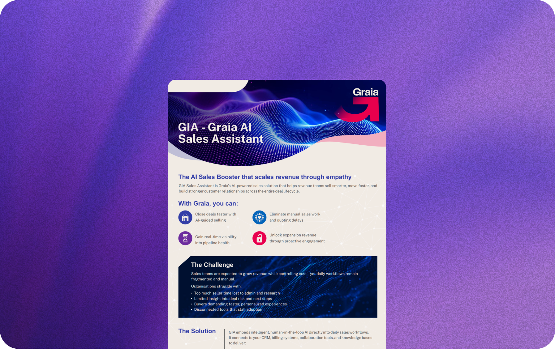 The product sheet outlines how Graia transforms traditional contact centres into proactive experience hubs. Through intelligent automation, contextual AI responses, and real-time agent support, organisations can resolve issues faster while delivering personalised and empathetic service at scale. This approach helps improve customer satisfaction, increase first-contact resolution, and reduce operational workload for support teams.