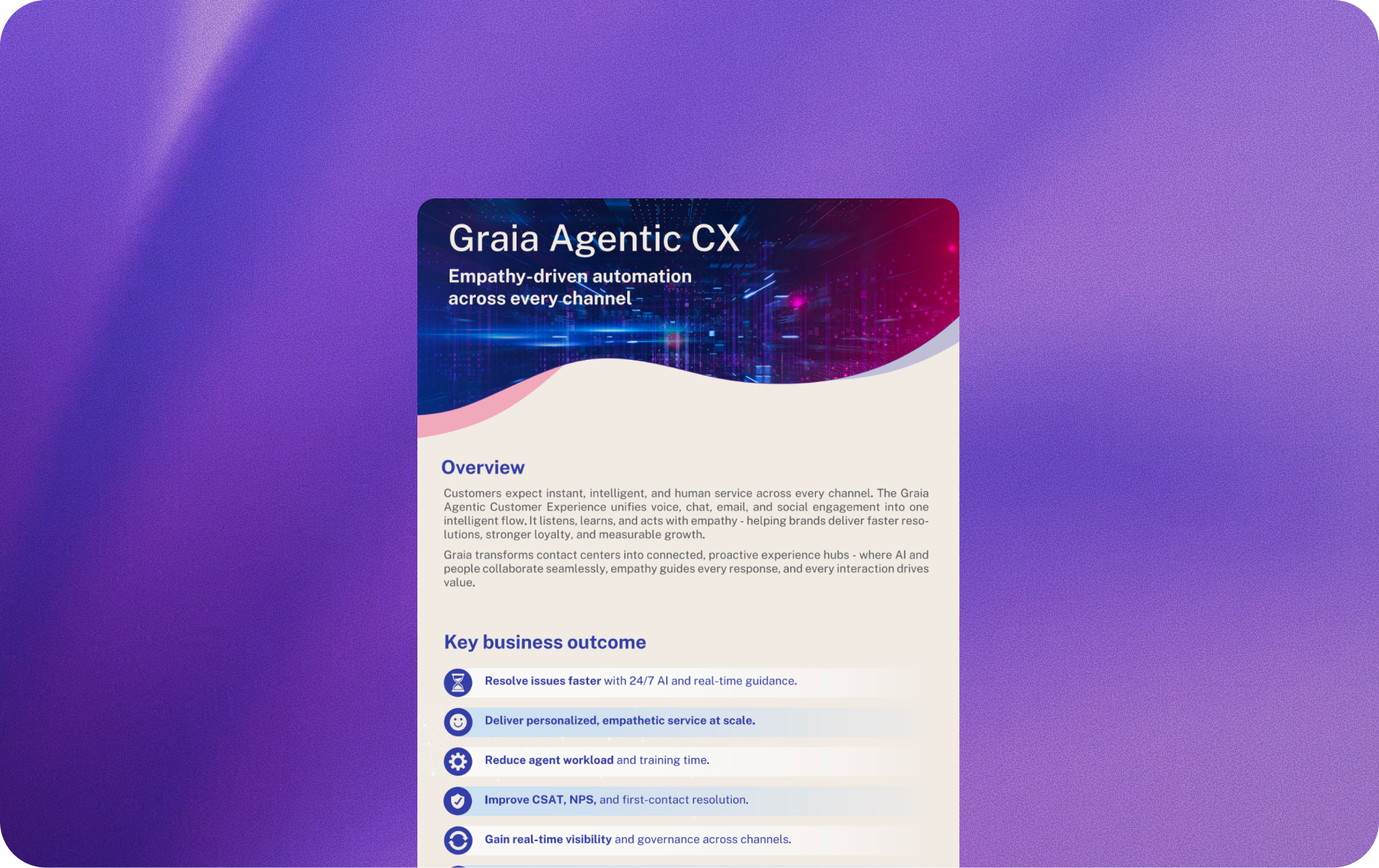For organisations seeking to modernise customer experience operations, this guide demonstrates how Graia Agentic CX delivers measurable results—from faster resolution times and higher agent productivity to reduced cost-to-serve and improved customer loyalty.