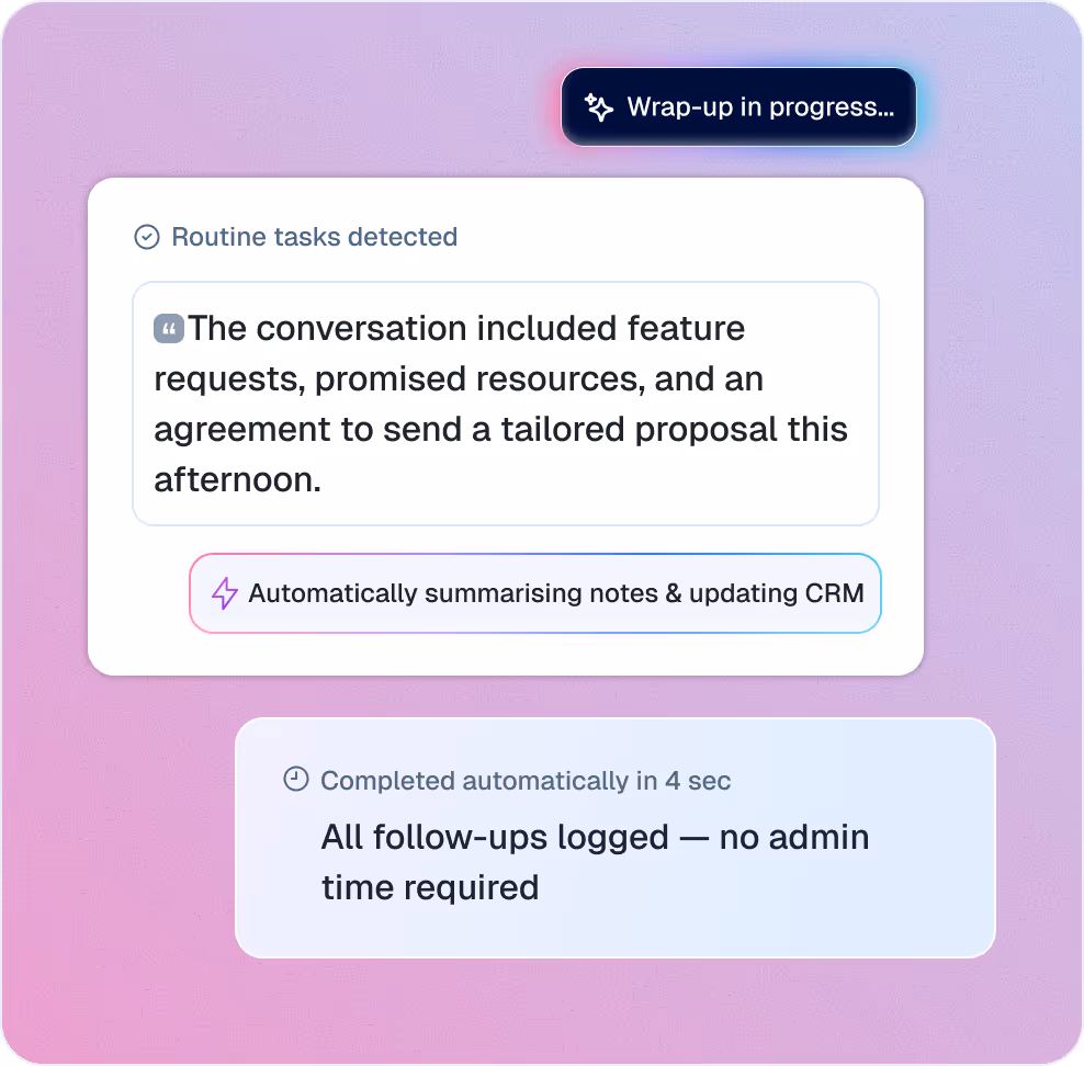 Summarizes notes, tracks promises, and updates CRM instantly.