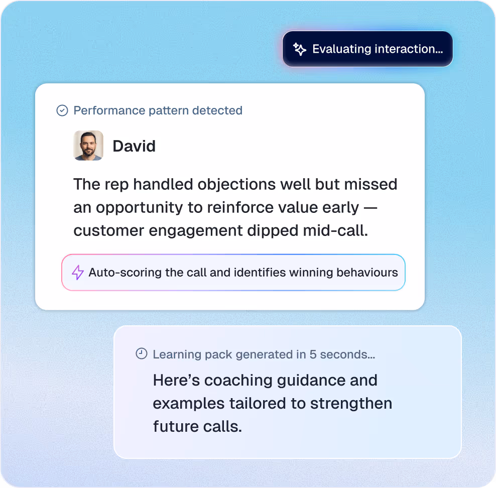 Auto-scores calls, identifies win patterns, and builds training packs.